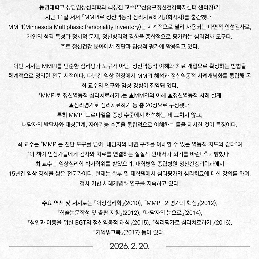 상담임상심리학과 최성진 교수, 「MMPI로 정신역동적 심리치료하기」출간