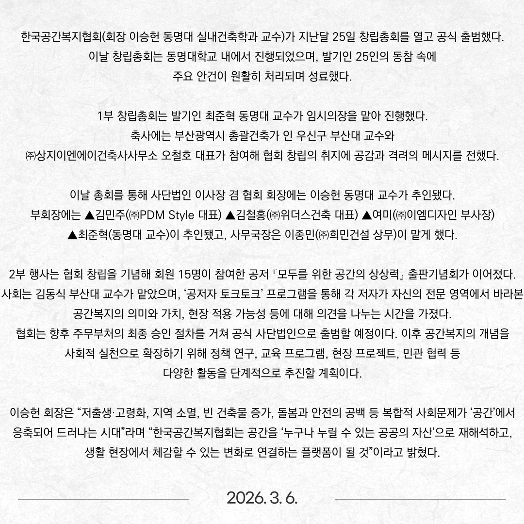 동명대서 한국공간복지협회 창립총회 개최 ‘모두를 위한 공간’ 실천 첫걸음