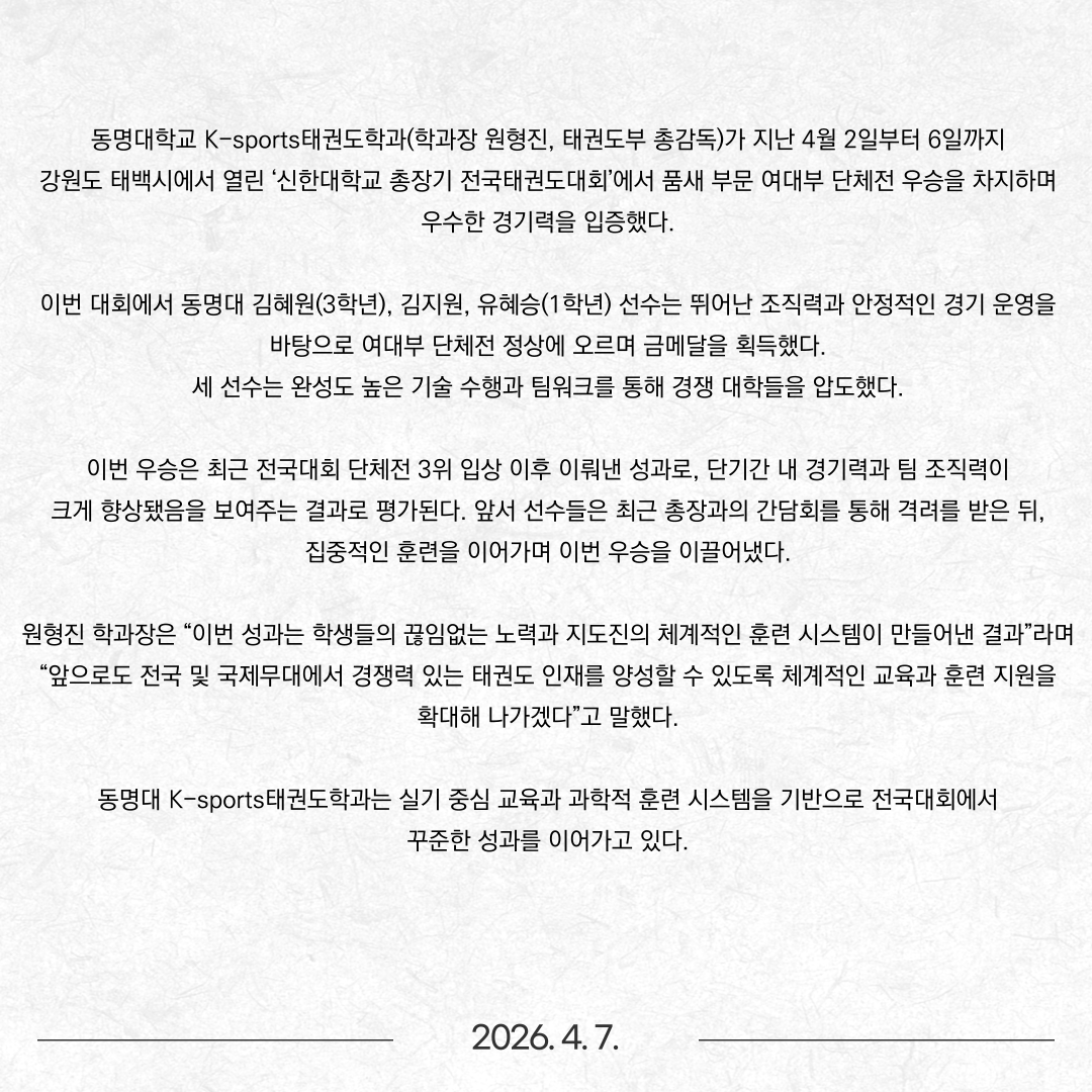 K-sports태권도학과, 신한대총장기 전국태권도대회 여대부 단체전 우승