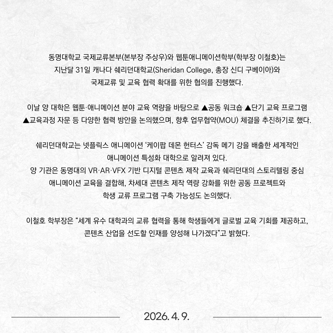 동명대, 캐나다 쉐리던대와 웹툰·애니메이션 교육 협력 추진